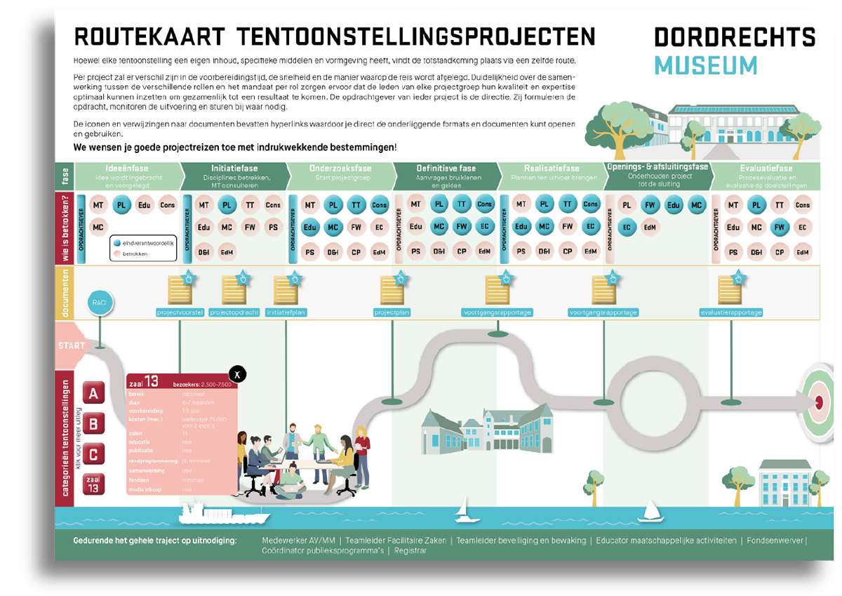 Interne infographic over projectmatig samenwerken aan tentoonstellingen binnen het Dordrechts Museum. Door op interactieve elementen te klikken, komen gebruikers bij de formats die per projectfase beschikbaar zijn.